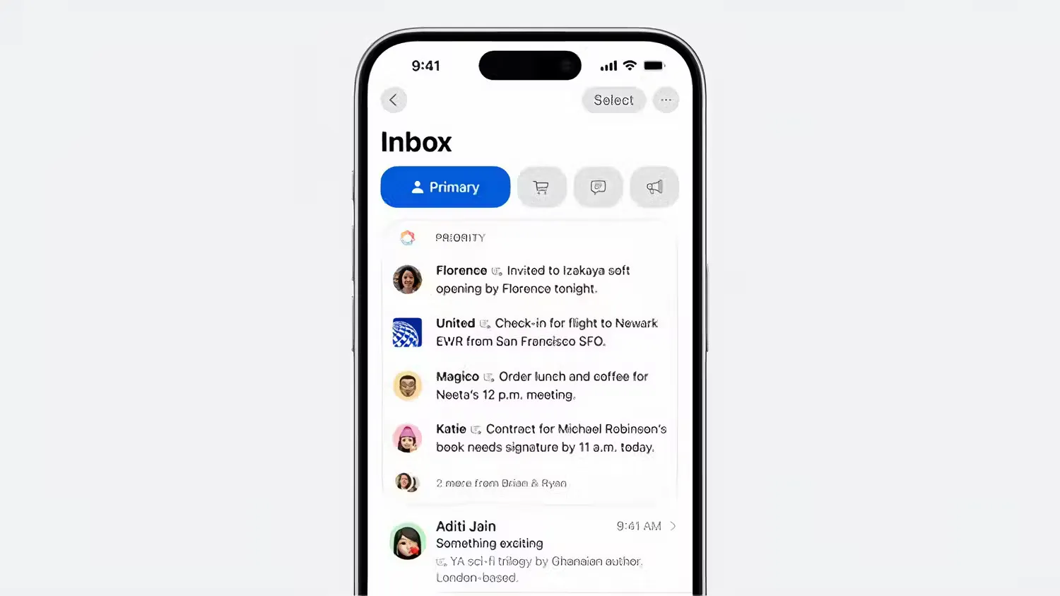 Fitur keempat adalah ringkasan email. Alih-alih menampilkan dua baris pertama dari setiap pesan seperti biasanya, kotak masuk email sekarang akan menampilkan ringkasan konten untuk setiap pesan. Mail juga dapat menggunakan AI untuk mengurutkan email berdasarkan prioritas sehingga email yang paling penting muncul di bagian atas kotak masuk.