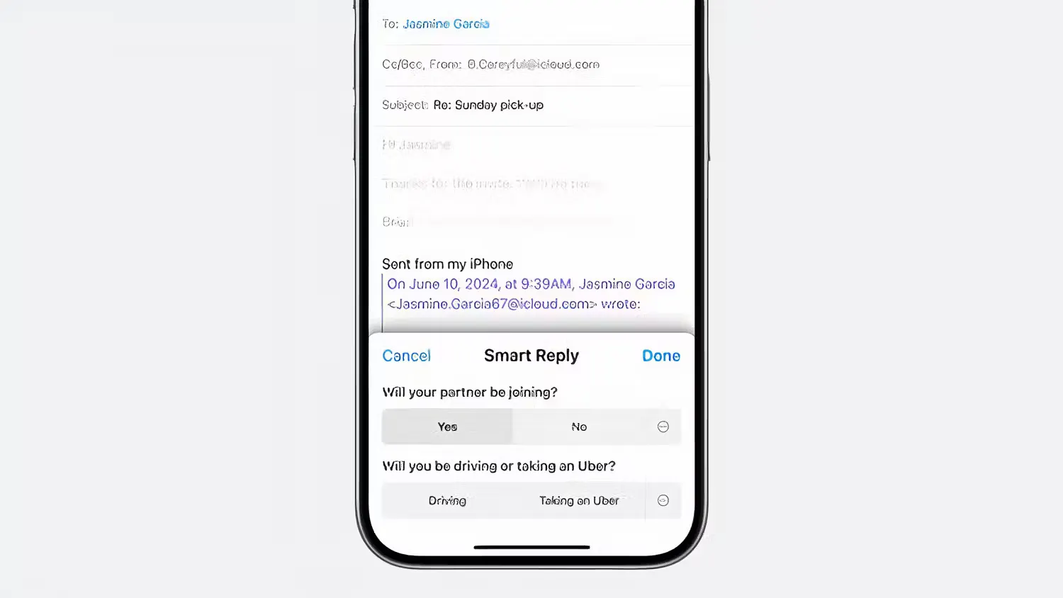 Fitur AI selanjutnya di iOS 18 adalah Smart Reply. Fitur ini memungkinkan pengguna membalas pesan atau e-mail dengan jawaban yang disarankan. Saran jawaban dibuat dengan melihat kata kunci yang ada. Jika pesan berisi pertanyaan, maka balasan yang disarankan akan memberikan saran jawaban potensial untuk pertanyaan tersebut.