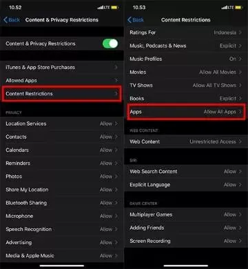 - Langkah berikutnya kamu masuk ke menu 'Content Restrictions', kemudian pilih 'Apps'