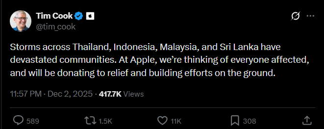 "Badai yang terjadi di Thailand, Indonesia, Malaysia, dan Sri Lanka telah menghancurkan komunitas. Di Apple, kita memikirkan semua orang yang terdampak, dan kami akan berdonasi untuk meringankan dan upaya pembangunan di lapangan." Ucapnya di unggahan akun X-nya.