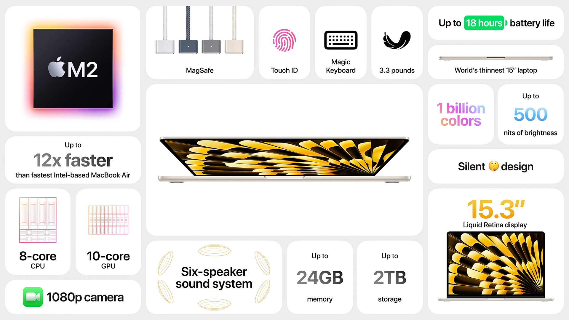 Generasi sebelumnya hanya menawarkan ukuran layar 11 inci dan 13 inci. Salah satu keunggulan MacBook Air 15 inci ini adalah ketebalannya yang "hanya" 1,15 cm, menjadikannya laptop 15 inci tertipis di dunia menurut klaim Apple.