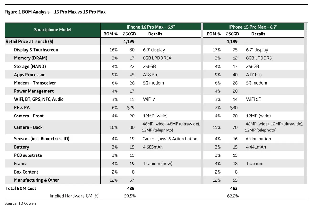 Pada iPhone 16 Pro Max, komponen termahal dimiliki oleh layar dan modul kamera belakang, yang masing-masing seharga USD 80 atau 16% dari total biaya produksi keseluruhan. Kamera juga mengalami kenaikan harga terbesar, dengan peningkatan USD 10 dibandingkan generasi sebelumnya.
