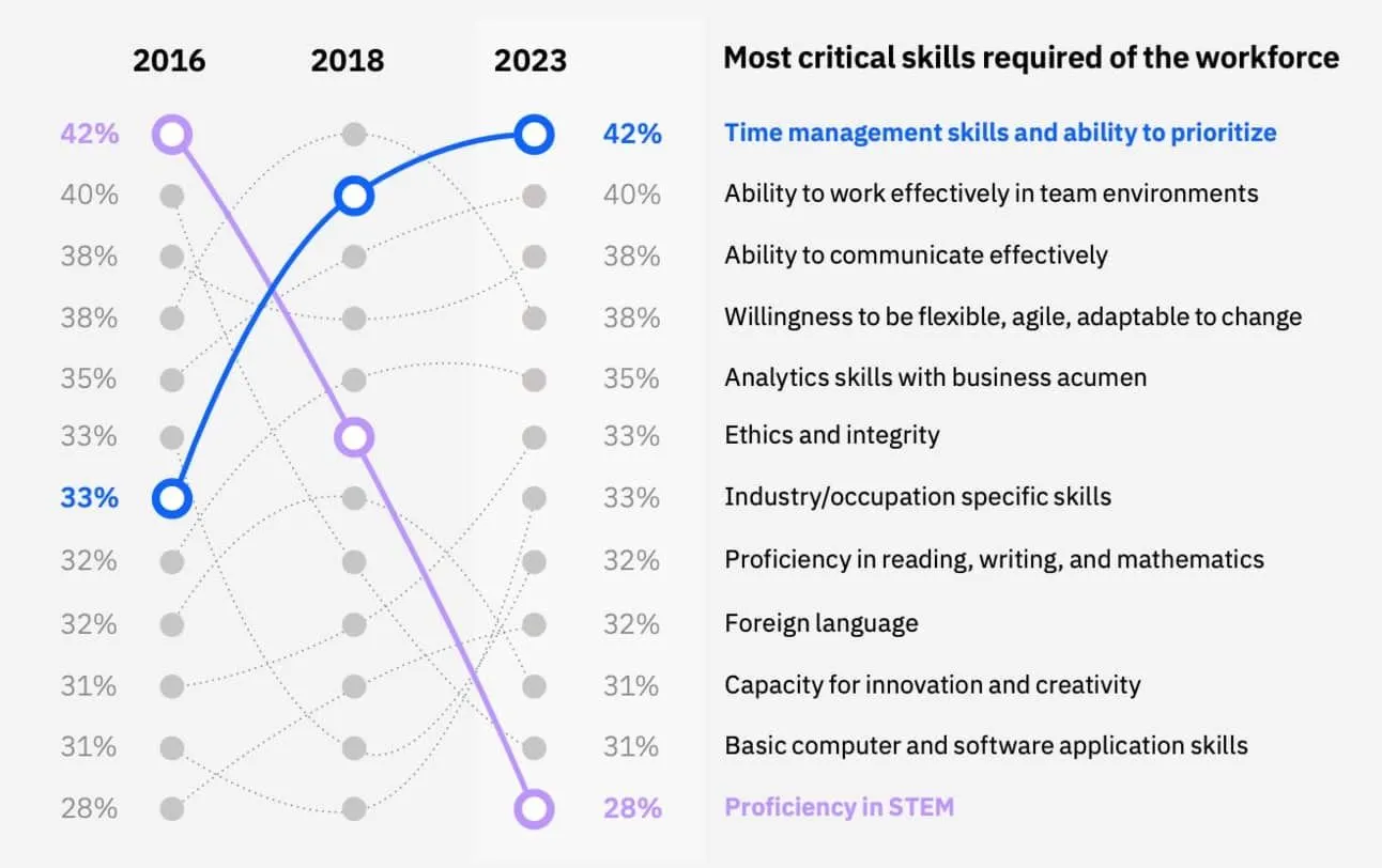 Tidak hanya tentang keterampilan teknis lagi; namun juga menilai seseorang dari “softskill-nya.” Kemampuan manajemen waktu yang efektif dan kemampuan komunikasi semakin penting. Perubahan ini terjadi karena munculnya alat-alat AI seperti ChatGPT, yang mengurangi kebutuhan untuk keahlian teknis. Perubahan ini tidak hanya memperluas potensi skill yang bisa dipakai, tetapi juga menciptakan lingkungan kerja yang lebih inklusif dan mudah beradaptasi.