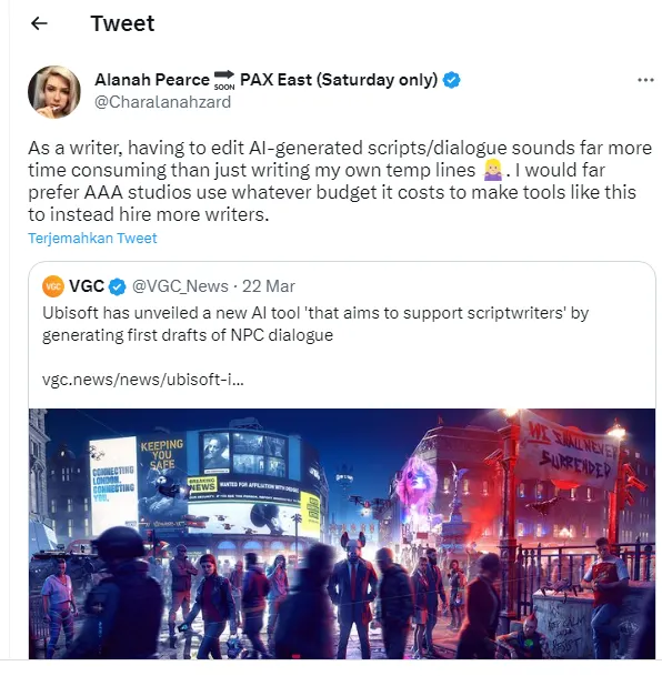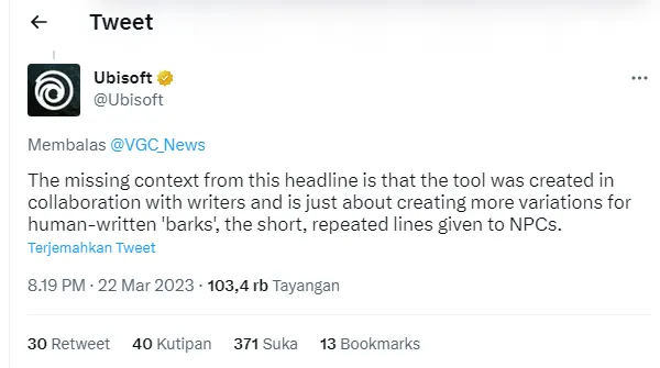 "Konteksnya sudah melenceng dari inti tujuannya, alat tersebut dibuat bekerja sama dengan penulis dan hanya tentang menciptakan lebih banyak variasi untuk basa-basi yang ditulis manusia, baris pendek dan berulang yang diberikan kepada NPC," tulis akun @Ubisoft.***