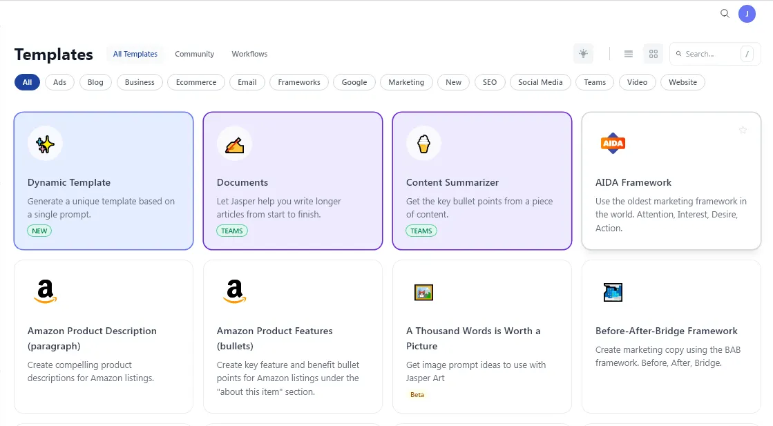 Bayangkan memiliki berbagai template atau outline untuk struktur seluruh tulisan kontenmu. Jasper AI memastikanmu memiliki titik mulai yang solid dalam proses kreatifmu. Jasper AI dapat membantumu dengan format apapun seperti postingan media sosial hingga FAQ.