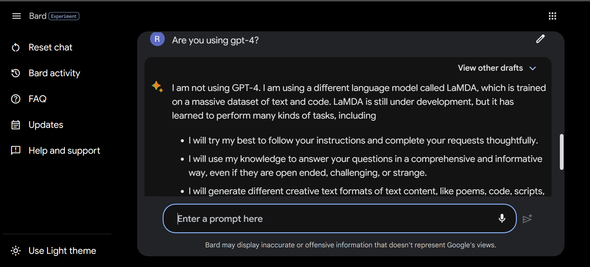 Bard AI ini fungsinya mirip dengan ChatGPT. Namun, berbeda dengan ChatGPT yang ditenagai model bahasa GPT-4, Bard AI ditenagai oleh LaMDA.