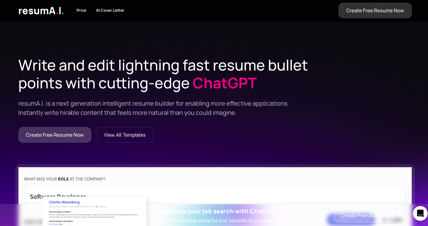 - Klik “Create Free Resume Now” untuk mulai membuat CV. Anda juga bisa klik “View All Templates” untuk melihat macam-macam template yang ditawarkan ResumAI.