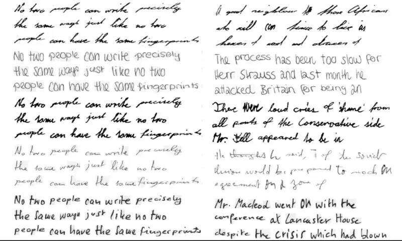 Jika kita melihat gambar diatas terdapat dua kolom tulisan tangan hasil AI dan kolom lainnya ditulis oleh manusia. Kolom kanan adalah contoh tulisan tangan dari enam penulis manusia yang berbeda yang dilatih oleh tim AI. Sedangkan kolom kiri merupakan hasil tangan masing-masing orang oleh AI baru yang disebut Handwriting Transformers (HWT).