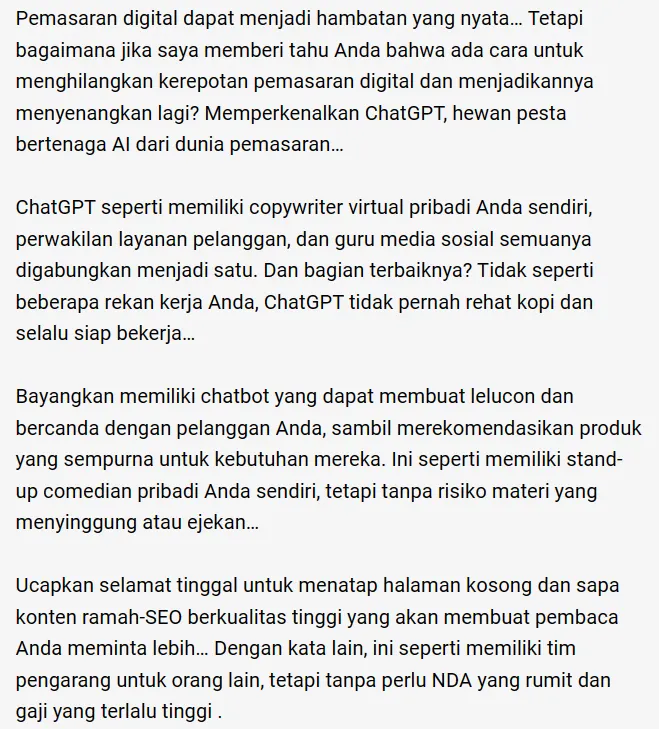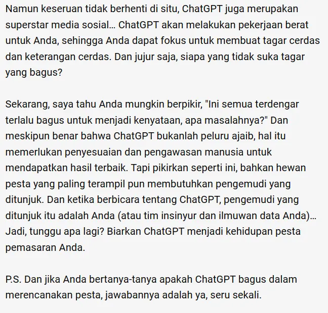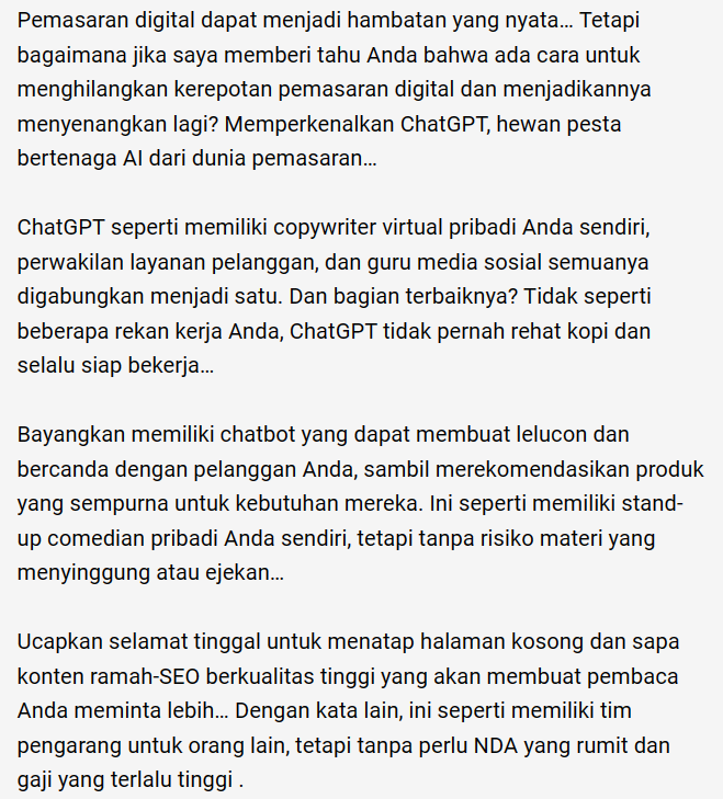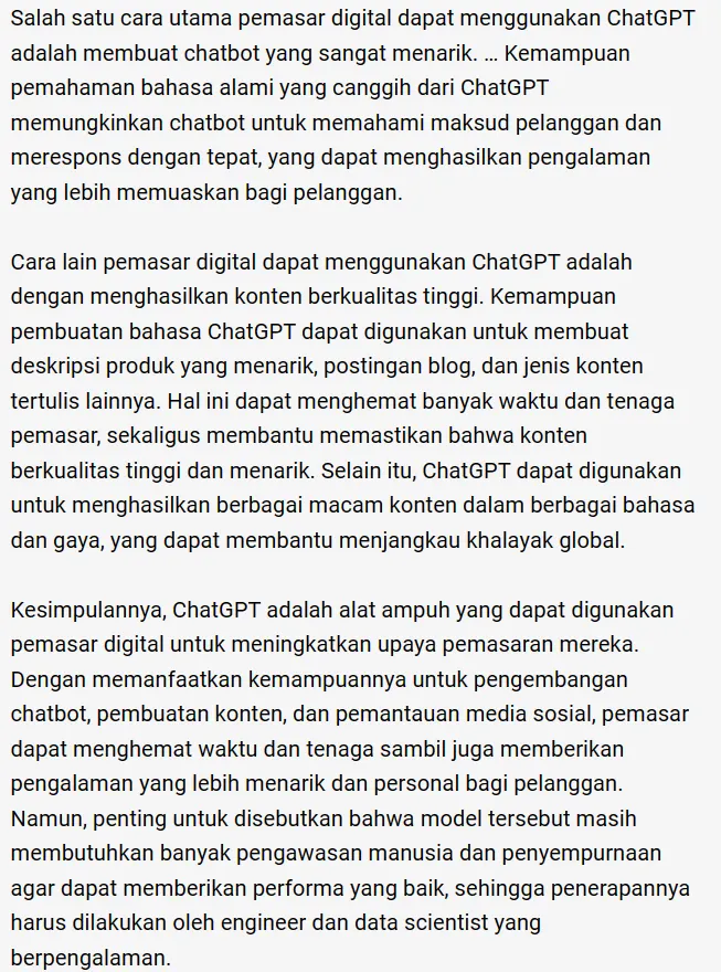 Dilansir dari MarTech, Josh Perlstein mencoba meminta ChatGPT untuk menulis artikel tentang bagaimana digital marketer harus menggunakan ChatGPT. Berikut hasil artikelnya.