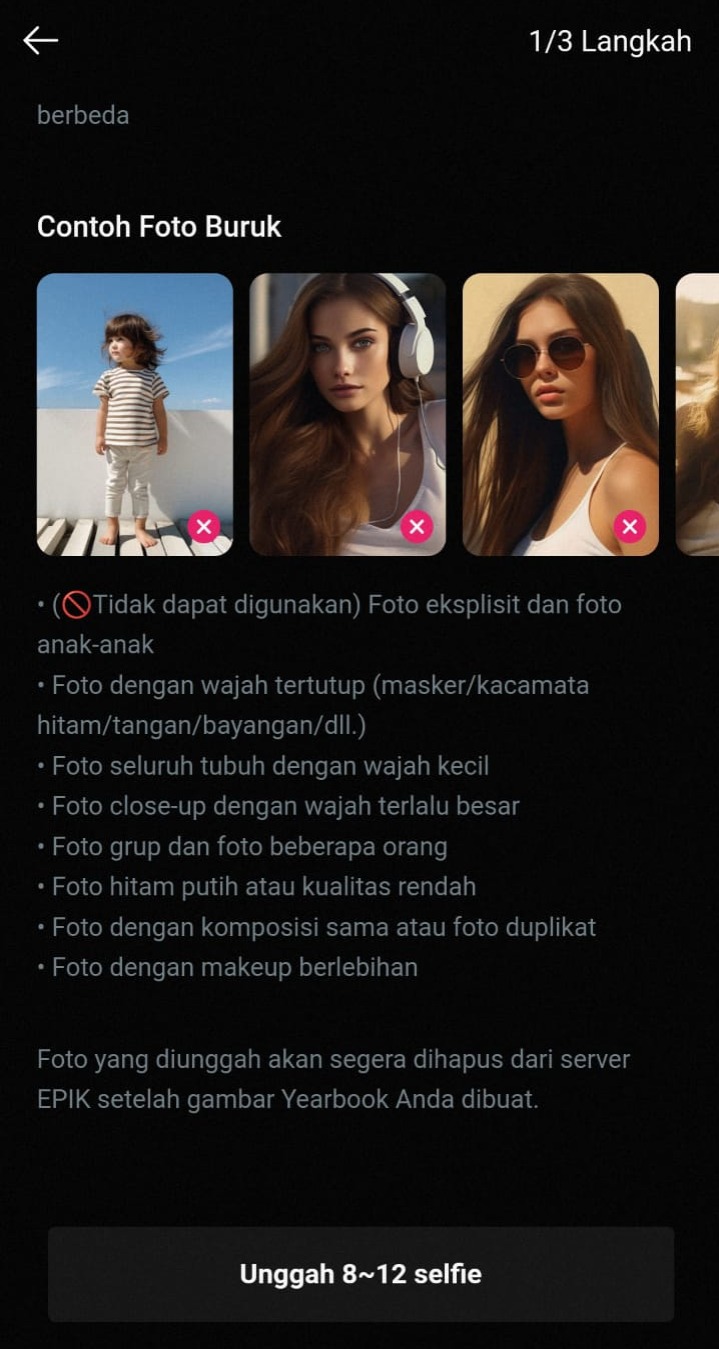 5. Pada tahap ini, EPIK meminta penggunanya untuk mengunggah foto selfie sebanyak 8-12 foto. Selain itu, EPIK memberikan ketentuan foto seperti apa yang harus diunggah.