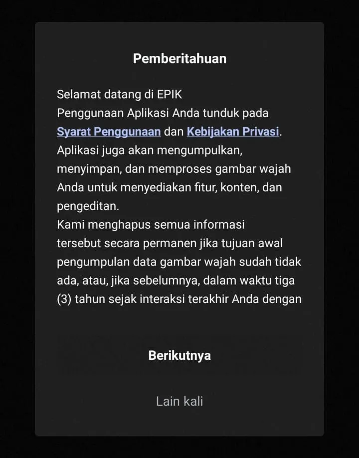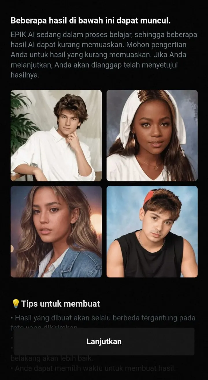 4. Sebelum mulai mengedit, EPIK memberitahu bahwa hasil pengeditan foto bisa saja kurang memuaskan. Oleh karena itu, diharapkan saat mengunggah foto, harus memperlihatkan wajah yang jelas. Jika semua sudah lengkap, klik “Lanjutkan”.