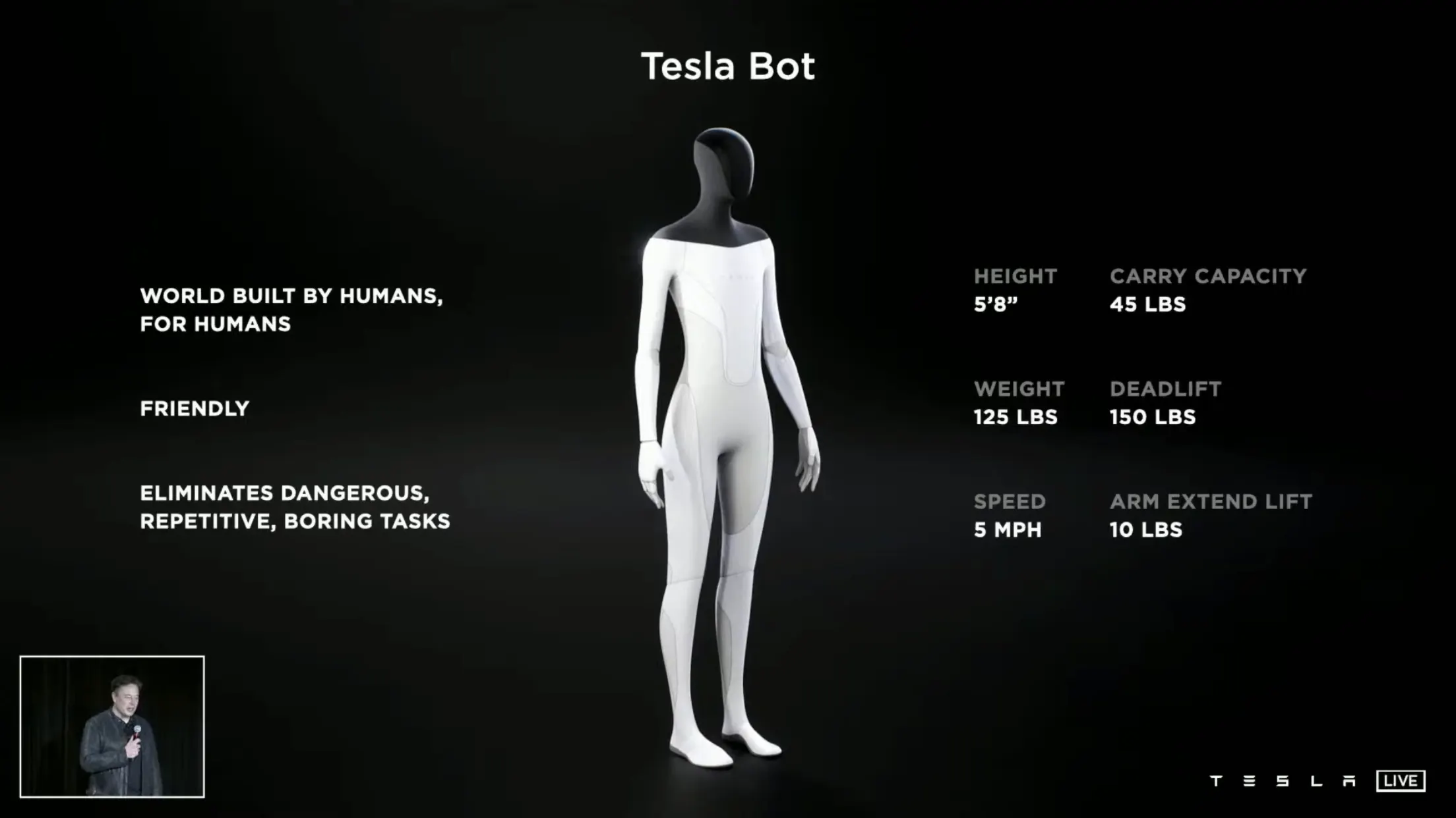 Tesla Bot adalah Artificial Intelligence yang dibuat dengan spesifikasi humanoid. Dengan tinggi 5’8” serta kecepatan 5 mil per jam, Tesla Bot dapat berjalan dan membantu aktivitas sehari-hari. Robot ini didesain sebagai robot yang friendly dan tahan air serta api.