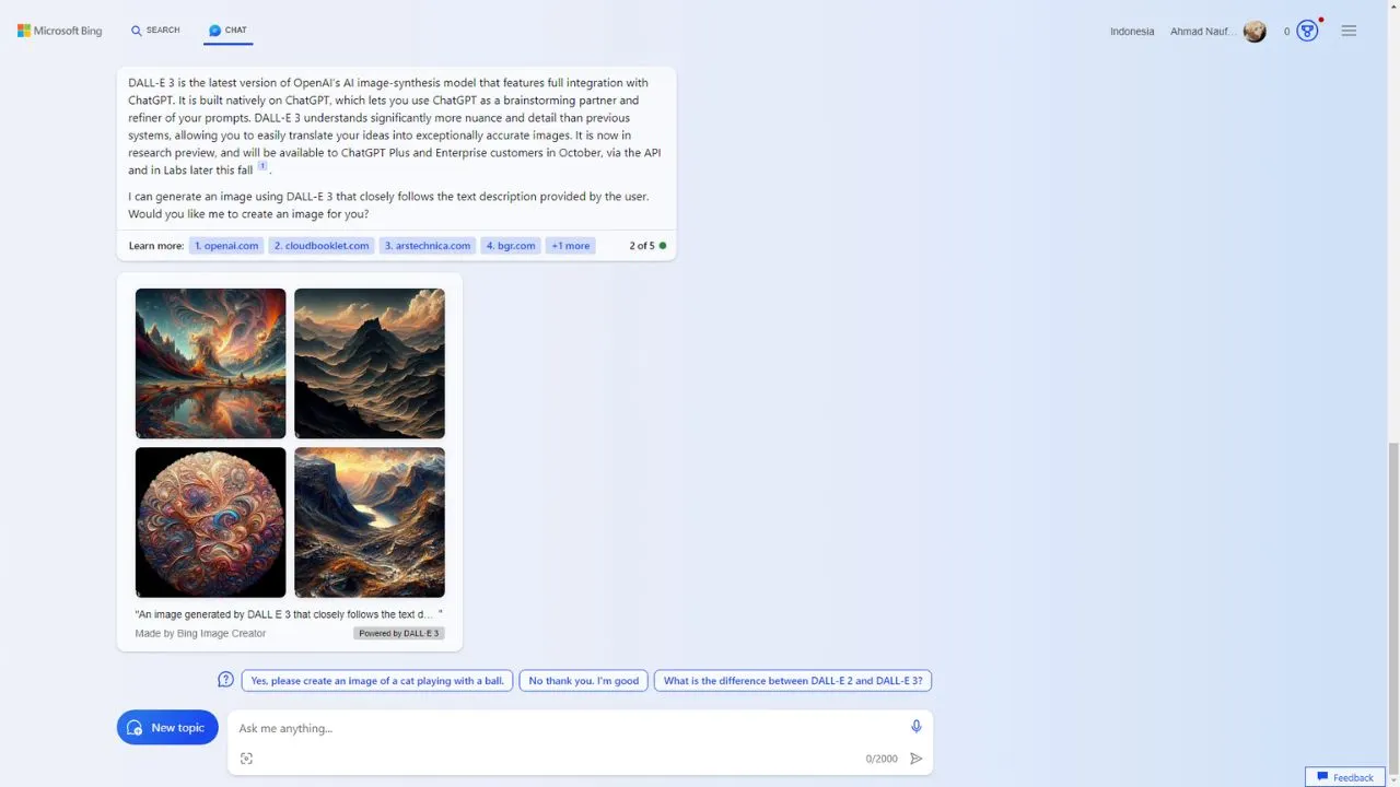 Dengan integrasi DALL-E 3 ke dalam Bing Chat, pengguna sekarang dapat menciptakan gambar-gambar menggunakan AI image generator ini secara langsung dari dalam percakapan mereka. Prosesnya sangat sederhana. Kamu hanya perlu memasukkan instruksi atau deskripsi tentang gambar yang ingin kamuciptakan, dan Bing Chat akan menggunakan DALL-E 3 untuk menghasilkan gambar yang sesuai dengan instruksi tersebut.