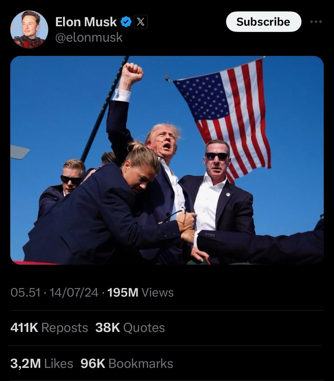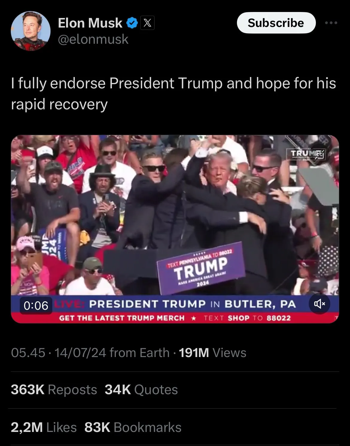 Dukungan demi dukungan muncul usai pemberitaan Trump tertembak saat berpidato diangkat. Melalui akun X pribadinya, Musk menggunggah tulisan "I fully endorse President Trump and hope for his rapid recovery" (saya mendukung sepenuhnya Presiden Trump dan berharap ia segera pulih). Tulisan tersebut diunggah bersamaan dengan video setelah Trump tertembak dan segera diamankan oleh para staff keamanan. Video tersebut menjadi salah satu unggahan viral karena menunjukkan sifat patriotisme dengan mengatakan "Fight, fight, fight" (berjuang, berjuang, berjuang) sambil mengepalkan tangan di udara.