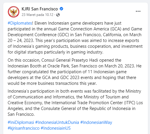 "Sebelas pengembang game Indonesia baru saja berpartisipasi dalam acara tahunan Game Connection America (GCA) dan Game Development Conference (GDC) di San Francisco, California, pada tanggal 20-24 Maret 2023. Keikutsertaan tahun ini bertujuan untuk meningkatkan ekspor produk game Indonesia, kerja sama bisnis, dan investasi bagi perusahaan rintisan (startup) digital khususnya di bidang game," tulisnya.
