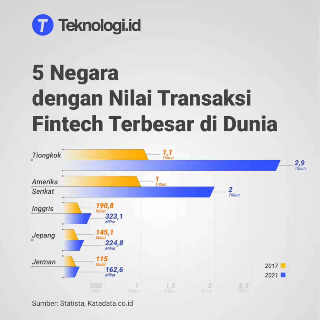 Tiongkok memiliki nilai transaksi fintech yang sangat besar dan mampu mengalahkan pasar fintech Amerika Serikat yang hanya mencapai US$ 1,03 triliun. Nilai transaksi yang dimiliki Tiongkok bahkan jauh meninggalkan pasar fintech di negara-negara maju seperti Inggris, Jepang, maupun Jerman.