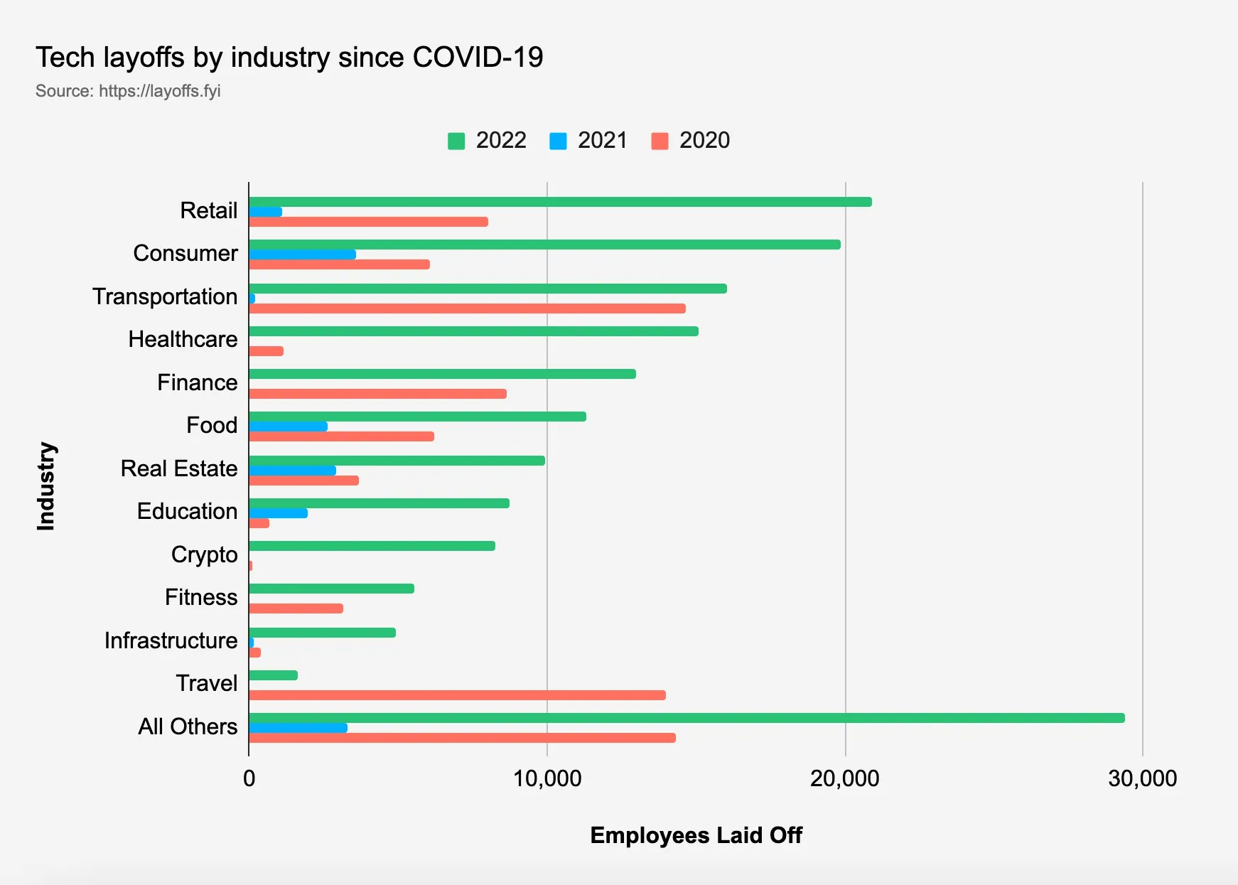 Jika dilihat lebih lanjut, berdasarkan data yang dipublikasikan oleh Layoffs.fyi, bahwa jika dilihat dari sektor perusahaan, maka yang paling banyak melakukan PHK di tahun 2022 adalah sektor ritel, yaitu sebanyak 20.914 karyawan. Diikuti oleh sektor konsumer yang memberhentikan 19.856 karyawan startup. Terdapat sektor infrastruktur yang telah melakukan PHK sebanyak 4.916 karyawan. Sedangkan, untuk startup di sektor travel terlihat paling sedikit melakukan PHK, yakni 1.637 orang.