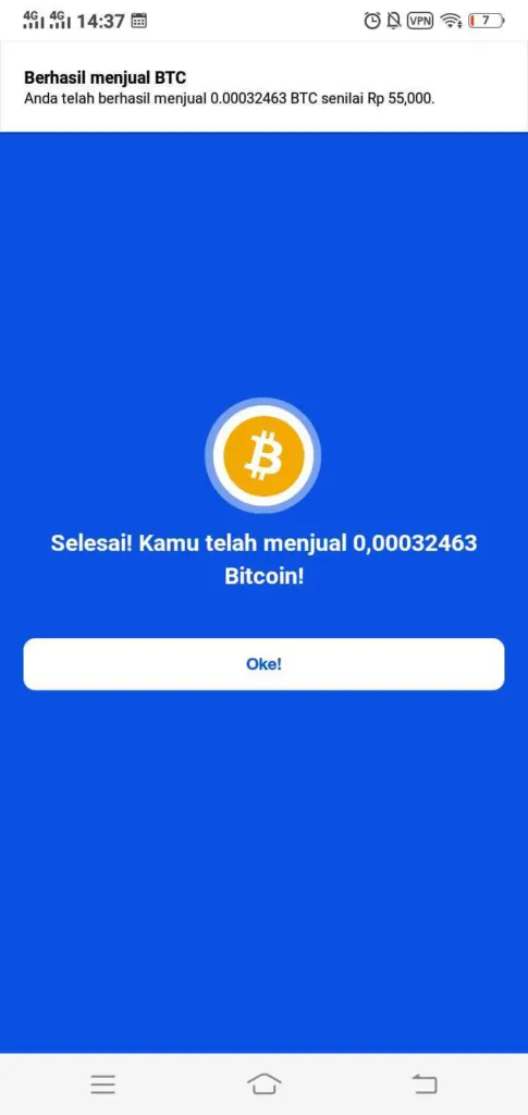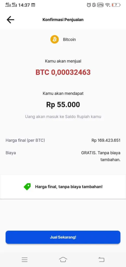 5.) Konfirmasi pembelian bitcoin. Harga final, tanpa biaya tambahan. Tap beli sekarang! VOILA! Kamu sudah berhasil membeli bitcoin!