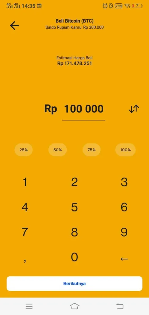 4.) Masukkan jumlah Bitcoin yang ingin kamu beli. Tap tombol berikutnya. Kamu bisa memasukkan jumlah Bitcoin yang ingin dibeli dalam Rupiah, atau kamu juga bisa membelinya dalam bentuk Bitcoin dengan tap tanda panah dua
