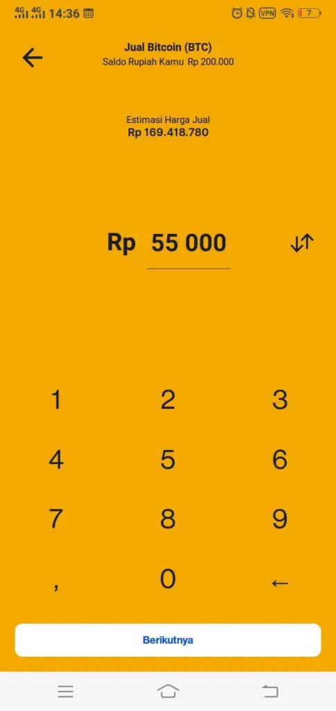 2.) Masukkan jumlah Bitcoin yang ingin kamu jual. Kamu bisa memasukkan jumlah Bitcoin yang ingin dijual dalam Rupiah, atau kamu juga bisa menjualnya dalam bentuk Bitcoin dengan tap tanda panah dua. Tap tombol berikutnya.