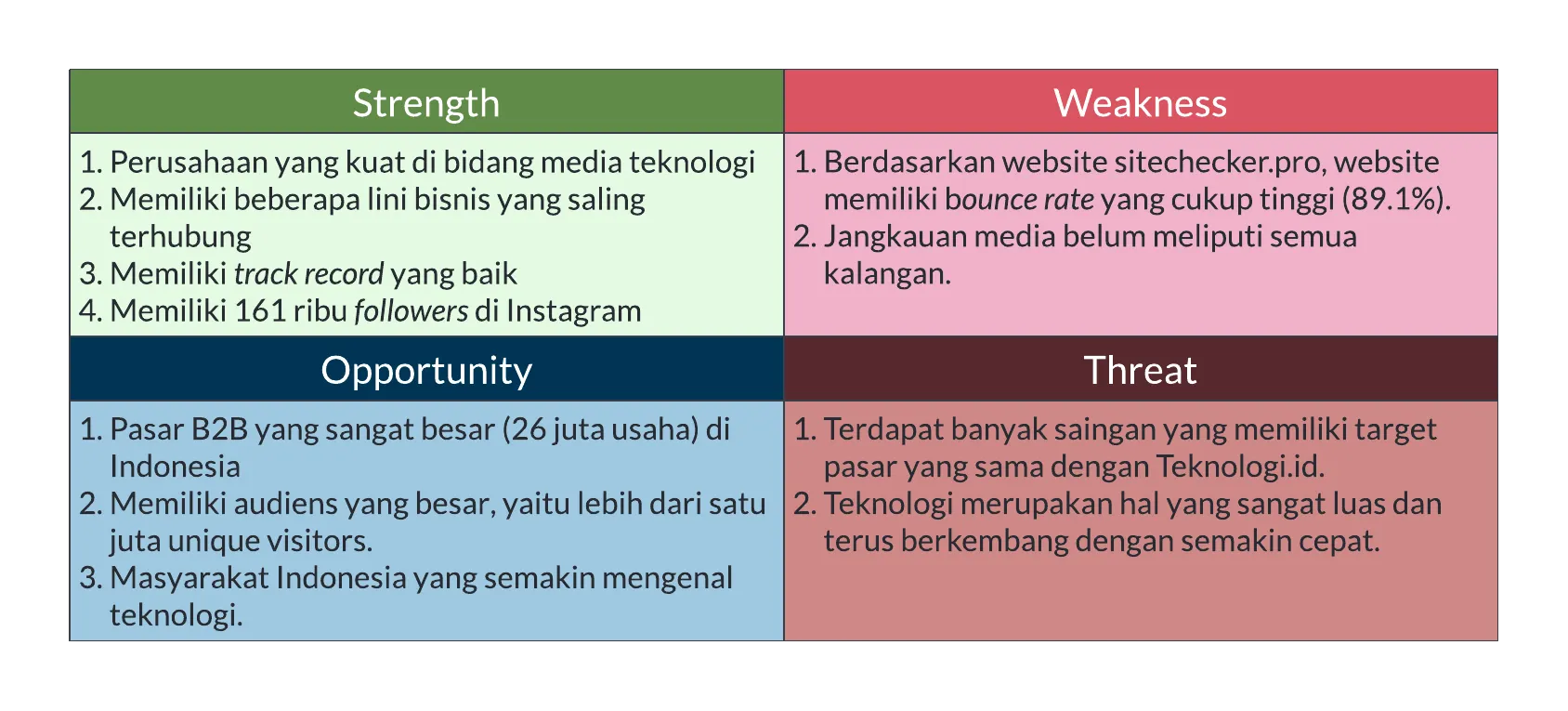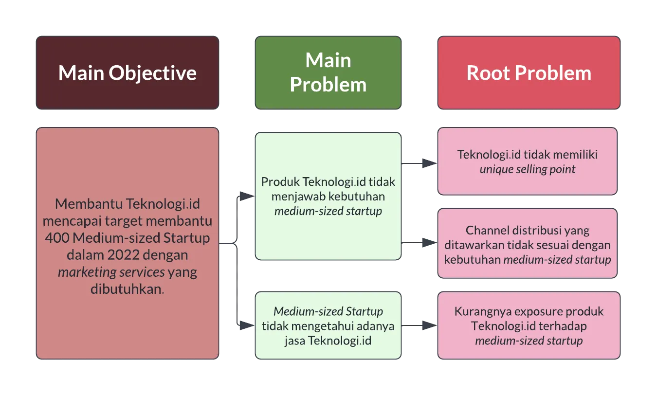 Dari tujuan utama Teknologi.id untuk membantu 400 medium-sizedstart-up dalam 2022, dapat teridentifikasi dua masalah utama yaitu medium-sized start-up yang mengetahui adanya Teknologi.id tetapi tidak merasa kebutuhannya terjawab dan yang tidak mengetahui adanya jasa Teknologi.id. Untuk menjawab dua keresahan utama tersebut maka perlu adanya identifikasi akar masalahnya di mana untuk kasus pertama didapat dua akar masalah yaitu kurangnya unique selling point dan channel distribusi yang tidak sesuai dengan kebutuhan medium-sizedstart-up. Untuk kasus kedua, akar masalah yang dapat ditemukan berupa kurangnya eksposur produk Teknologi.id terhadap perintis medium-sizedstart-up. Untuk menyelesaikan akar-akar masalah tersebut demi terwujudnya tujuan utama Teknologi.id, digunakan analisis SWOT dari Teknologi.id untuk mengetahui kelebihan yang dapat dimanfaatkan dan kekurangan yang harus dicari solusinya.