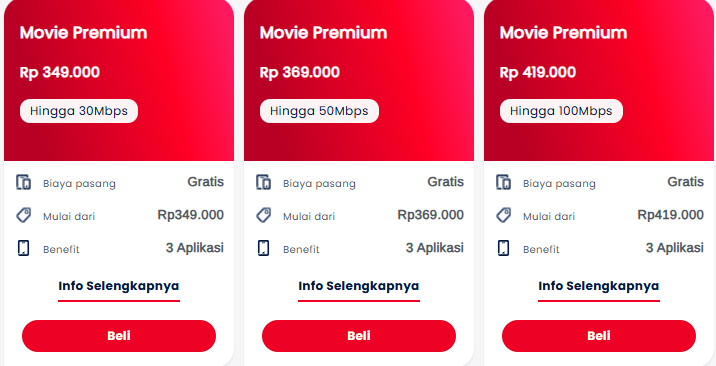 Dengan mulai berlangganan IndiHome Movie dari harga Rp 309.000 hingga Rp 469.000, pengguna sudah bisa mendapatkan sejumlah benefit yang ditawarkan oleh setiap paketnya. Seperti, paket langganan Movie Complete terbaru menawarkan kecepatan internet hingga 100 Mbps serta benefit akses streaming film dan serial televisi di 13 layanan OTT atau over-the-top. Berikut 13 layanan OTT yang dapat diakses pelanggan paket IndiHome Movie.
