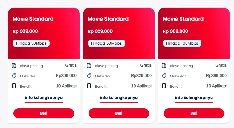 Sebelumnya, paket ini sudah lebih dahulu diperkenalkan dan tersedia pada bulan Maret lalu. Paket langganan IndiHome Movie Standard menawarkan pilihan kecepatan mulai 30 Mbps hingga 100 Mbps dengan banderol harga mulai dari Rp349.000 hingga Rp419.000. Meskipun hanya bisa mengakses tiga aplikasi streaming, tetapi paket ini bisa mengakses aplikasi 3 terlaris OTT, yaitu Netflix, Dinsey Plus Hotstar, dan juga IndiHome TV \