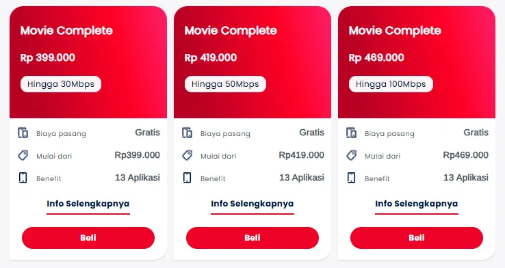 Paket Movie Complete merupakan salah satu paket terbaru dari IndiHome Movie. Paket ini juga menyediakan opsi kecepatan mulai 30 Mbps hingga 100 Mbps dengan harga tersedia dari Rp399.000 - Rp469.000. Lebih lengkap lagi, dengan berlangganan paket Movie Complete, pengguna bisa mendapatkan benefit akses ke 13 aplikasi streaming OTT, di antaranya Catchplay, Disney Plus Hotstar, Fita, Genflix, Kuncie, Lionsgate Play, Netflix, Prime, Sushiroll, Vidio, Viu, WeTV, dan IndiHome TV