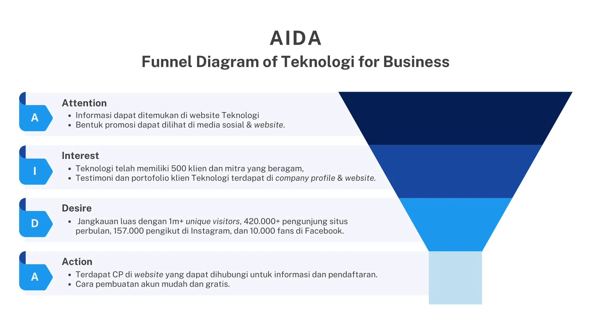 Berdasarkan framework AIDA, informasi layanan Teknologi masih sulit didapat oleh konsumen, tentunya yang masih awam. Walaupun terdapat paket yang tertera di landing page, informasi tersebut kurang eye-catching dan sulit dibaca. Oleh karena itu, dibutuhkan sarana informasi yang lengkap dan mudah dijangkau.