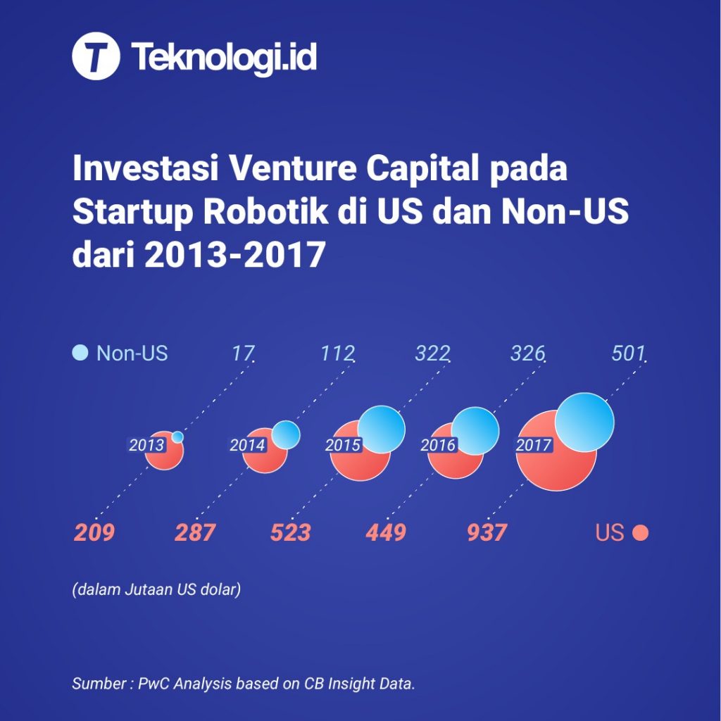 Maka dari itu bukanlah tidak mungkin teknologi robotika akan terus berkembang menjadi teknologi otomatisasi yang semakin besar mengingat dukungan yang terus bertambah dari tahun ke tahun. Bagan di bawah ini menunjukkan Investasi Venture Capital pada Startup Robotik di US dan Non-US dari 2013-2017 (dalam miliar US dolar).