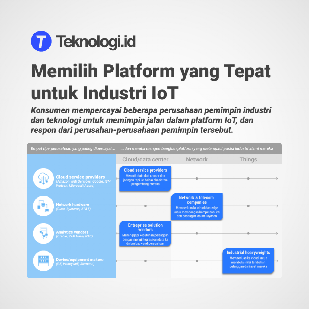 Beberapa perusahaan penyedia platform terkemuka turut mengembangkan IoT dengan cara yang berbeda tergantung pada ambisi dan kekuatan tradisional mereka (lihat bagan di bawah ini). Misalnya, penyedia