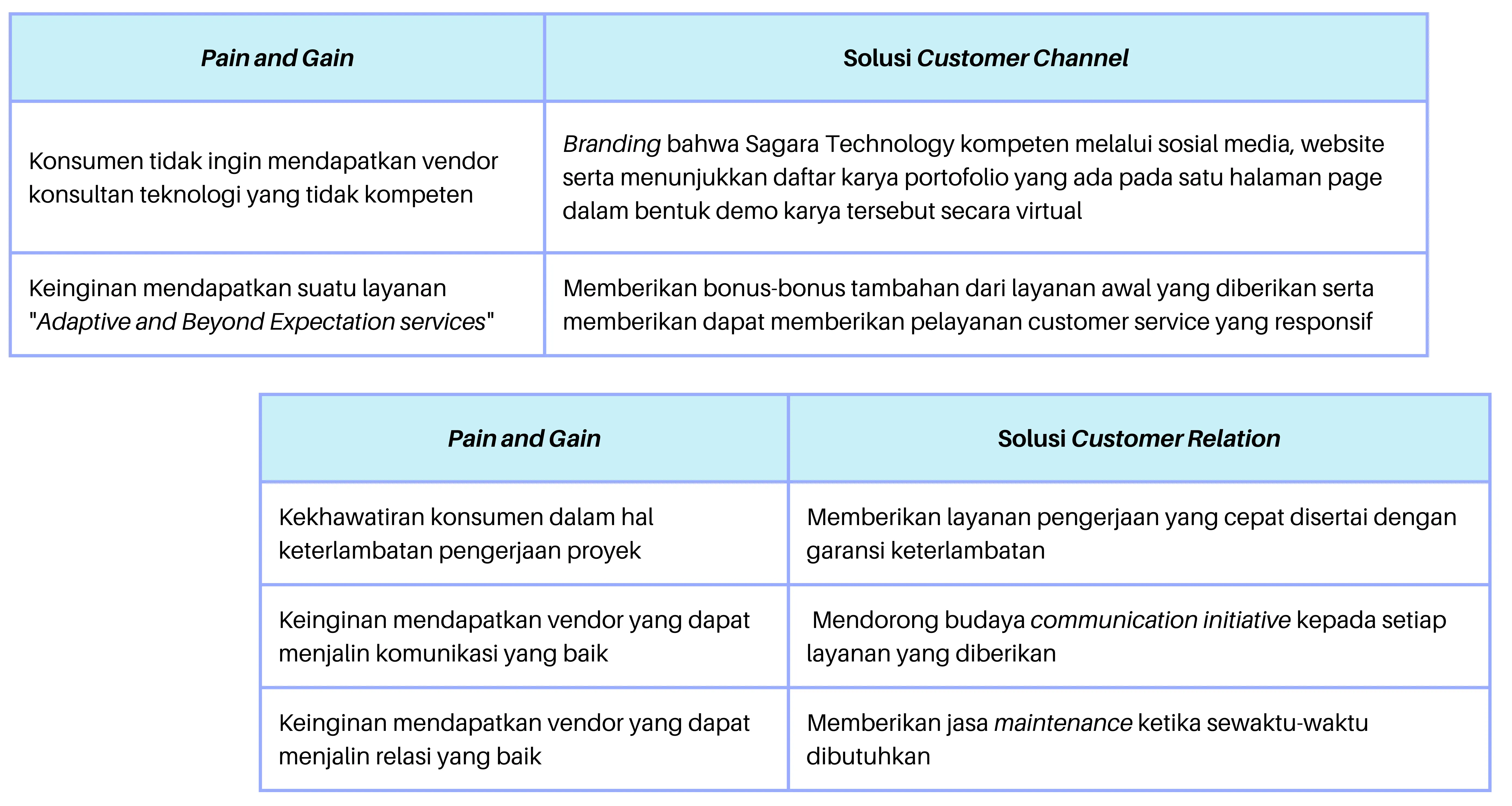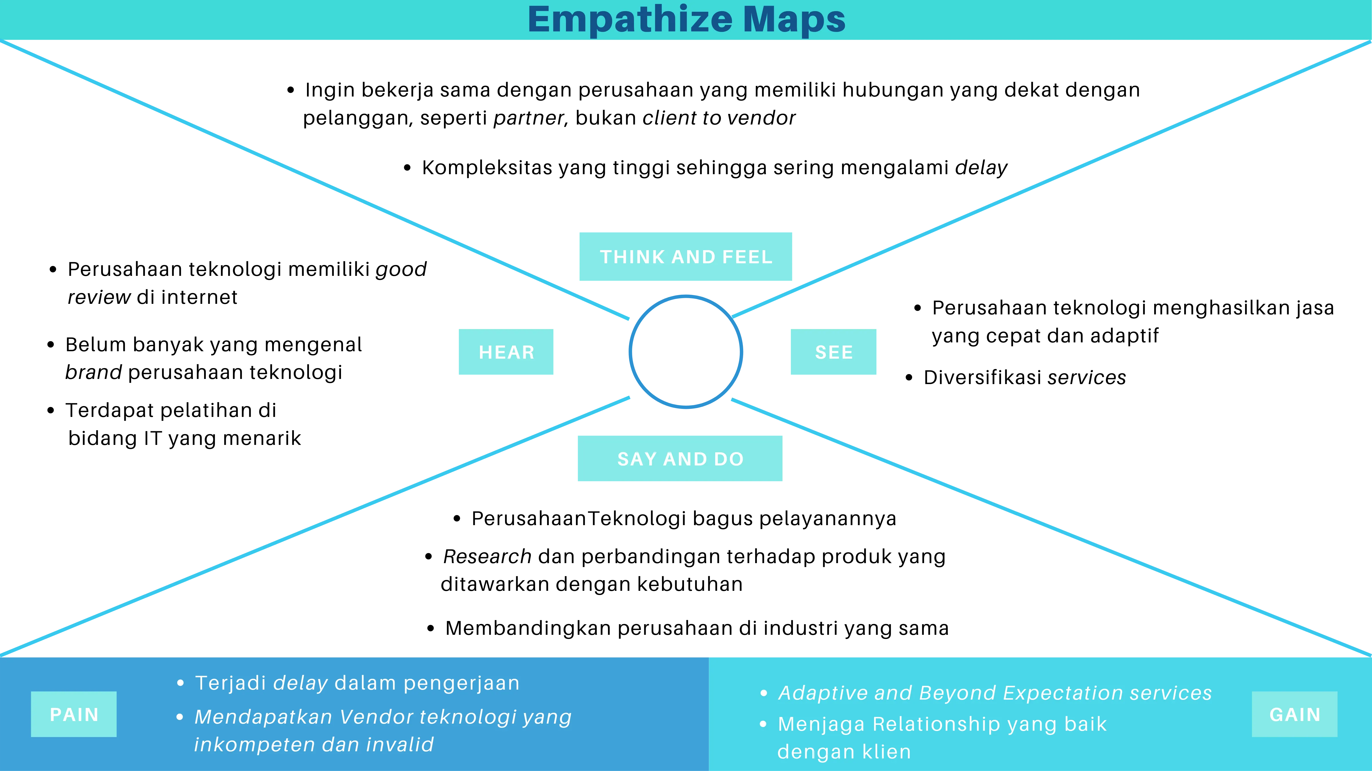 Sagara Technology menggunakan empathize map sebagai metode untuk mengenal kebutuhan dan keinginan konsumen serta menyelaraskannya dengan strategi bisnis perusahaan. Fokus yang telah disajikan pada gambar menghasilkan pain mengenai kebutuhan yang masih harus dipenuhi untuk menciptakan kepuasan konsumen, sedangkan gain merupakan nilai tambah yang dimiliki perusahaan dari perspektif konsumen.