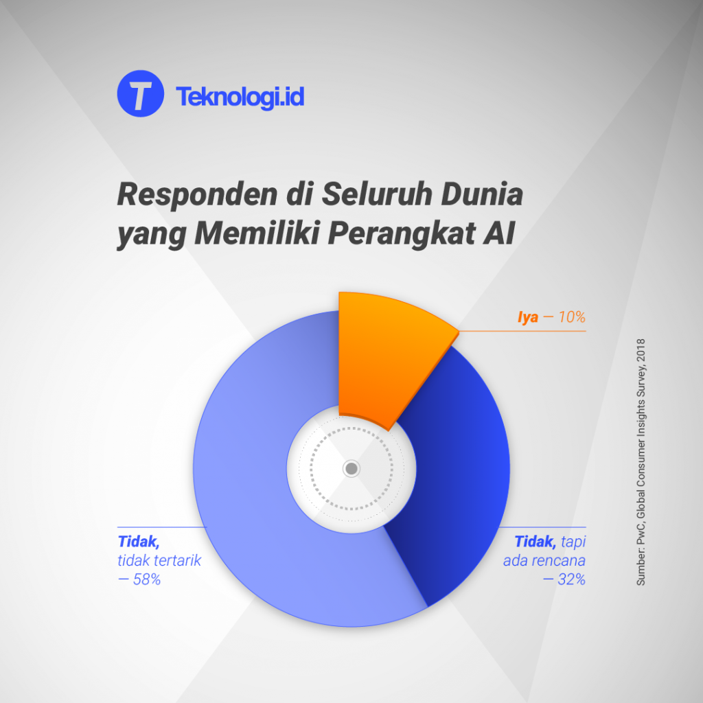 Hasil dari survey yang dapat dilihat dari diagram diatas ini menunjukkan sebanyak 58% persen responden dari 22.000 menyatakan bahwa mereça tidak tertarik dengan penerapan AI maupun memiliki perangkat AI. Terbanyak kedua adalah sebanyak 32% responden menyatakan bahwa mereka belum memiliki perangkat AI namun berencana memilikinya. Disamping itu, sebanyak 10% responden menyatakan bahwa mereka telah memiliki perangkat AI.