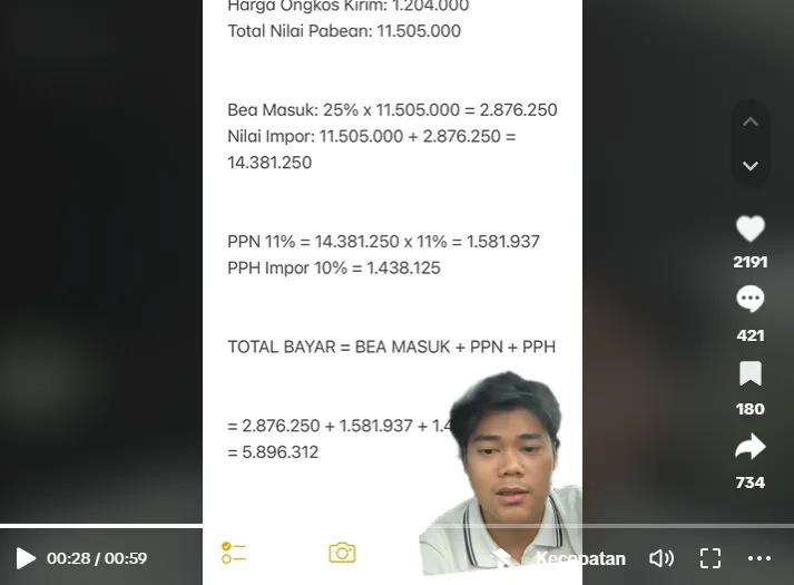 Dalam video tersebut, pengunggah mengungkapkan bahwa ia dikenakan bea masuk sebesar puluhan juta rupiah saat membeli sepatu dari luar negeri dengan biaya pengiriman sebesar Rp 1.204.000. Menurutnya, harga yang seharusnya dibayarkan adalah Rp 11.505.000, dengan tambahan Rp 5.896.312 untuk bea masuk, bukan sebesar Rp 31.810.343.