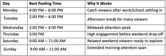 Try A/B testing different time slots for similar types of content. Post one video at 2 PM on Tuesday and another similar video at 7 PM on Thursday. Compare the performance after a week. The results might surprise you.