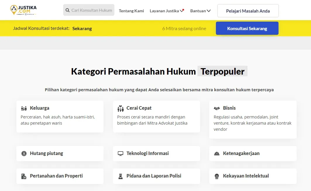 Bagi kalian yang masih bingung bagaimana menyikapi permasalahan hukum yang sedang dihadapi, kalian juga bisa mempelajari terlebih dahulu kategori hukum yang sesuai dengan langsung mengunjungi situs Justika.