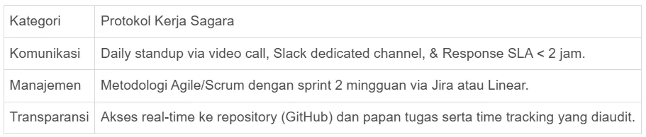 Mengelola tim lintas negara membutuhkan sistem yang lebih ketat. Sagara menggunakan Offshore Collaboration Framework yang mengedepankan transparansi: