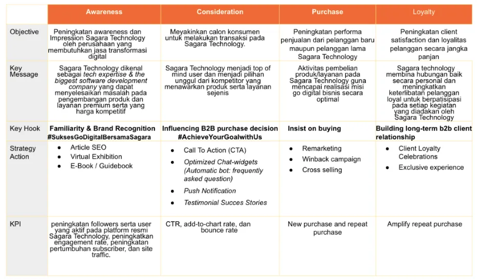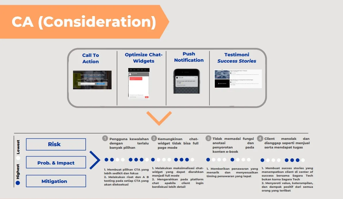 Consideration adalah tahap calon pelanggan mulai mempertimbangkan produk dan layanan dari Sagara Technology, kemudian membandingkannya dengan merek lainnya lalu mempelajari lebih detail berbagai fitur dan manfaat yang ditawarkan. Berikut ini merupakan 3 strategi pemasaran guna meningkatkan ketertarikan calon konsumen pada produk serta layanan Sagara Technology: