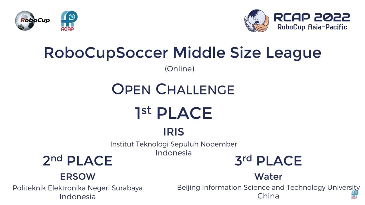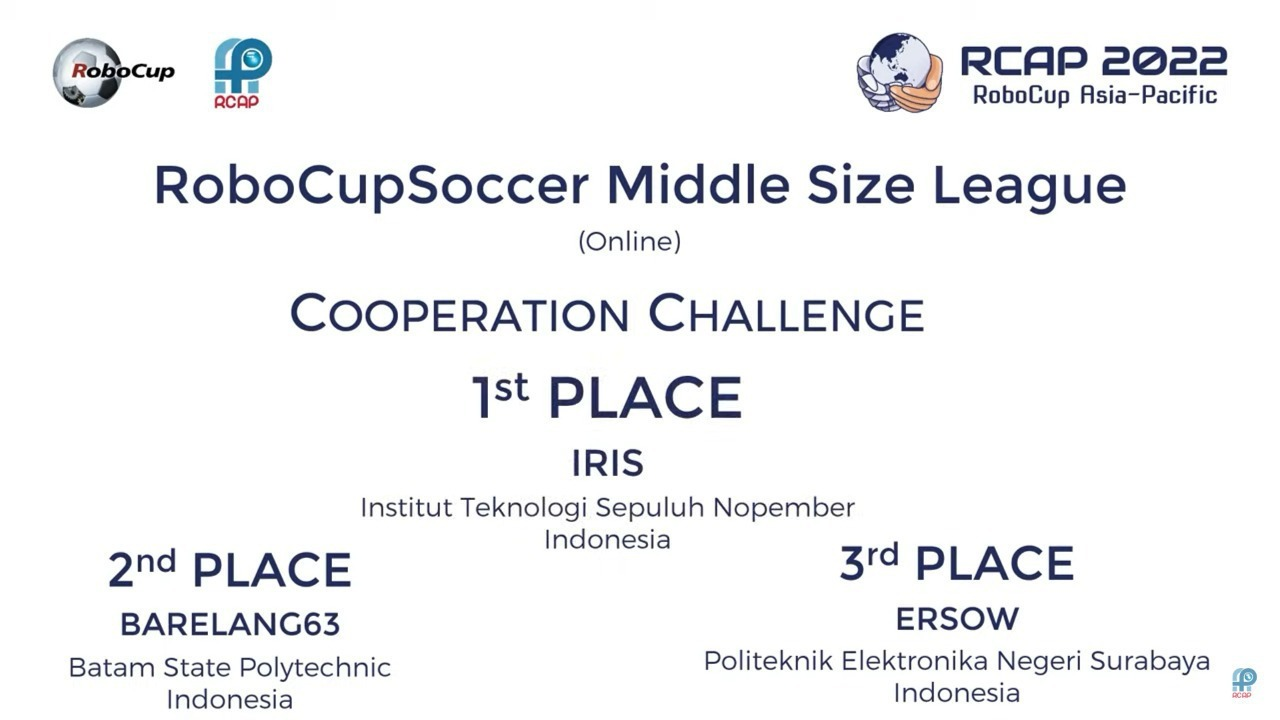 Kategori Cooperation Challenge pada RoboCup Asia Pacific berhasil dimenangkan oleh tim IRIS ITS sebagai juara I.