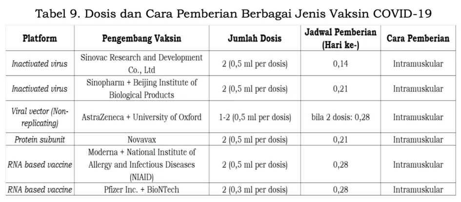 Rata-rata vaksin harus disuntikkan dua kali alias dua dosis dalam rentan jarak penyuntikan 14 hari hingga 28 hari. Berikut adalah data rinci mengenai dosis dan cara pemberian berbagai jenis vaksin COVID-19 yang akan disuntikkan ke warga Indonesia.