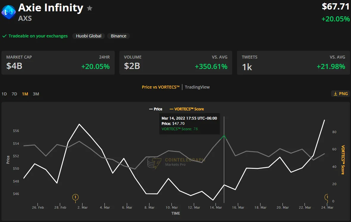 (hijau) vs. harga AXS. Sumber: Cointelegraph Markets ProSeperti yang terlihat pada grafik diatas, Skor VORTECS