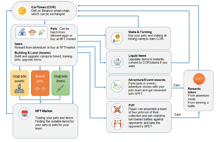 Staking: Pemain dapat mempertaruhkan hewan di Kamp Penambangan untuk mengumpulkan token COR. Semakin langka hewan yang dipanggil, semakin tinggi kecepatan pengumpulannya.