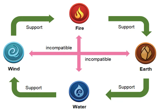 Dan seperti halnya permainan elemental lain, akan ada keunggulan masing-masing dari tiap elemen seperti “Bumi lebih kuat Air”, “Air lebih kuat dari Api”, “Api lebih kuat dari Udara” dan “Udara lebih kuat dari Bumi.” Detailnya dapat Anda lihat pada gambar di bawah ini: