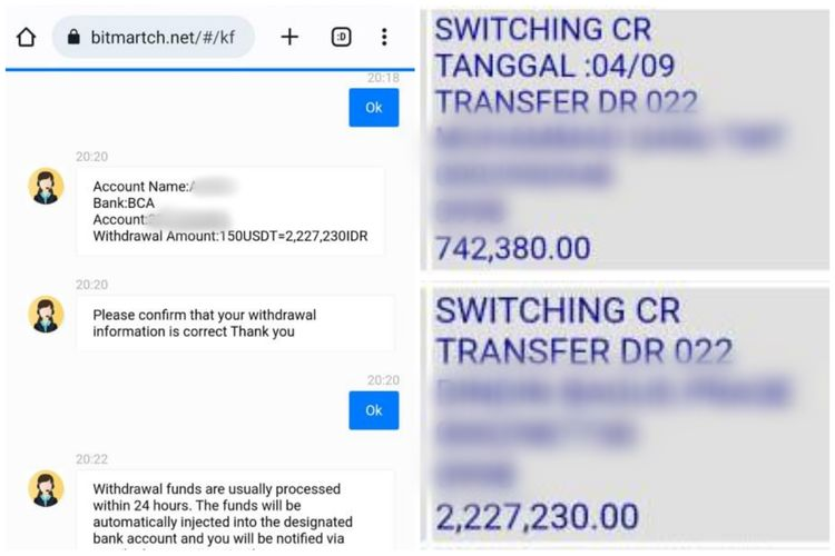 Foto: Screenshot hasil bukti penarikan uang dari bitmartch.net ke rekening AA. (KompasTekno)