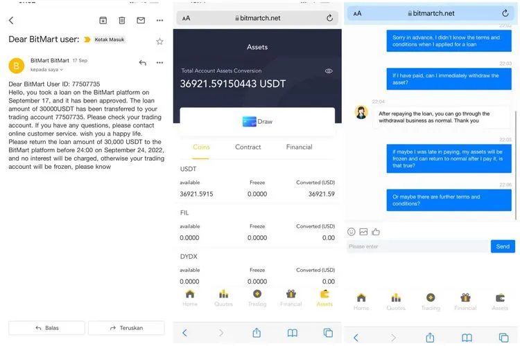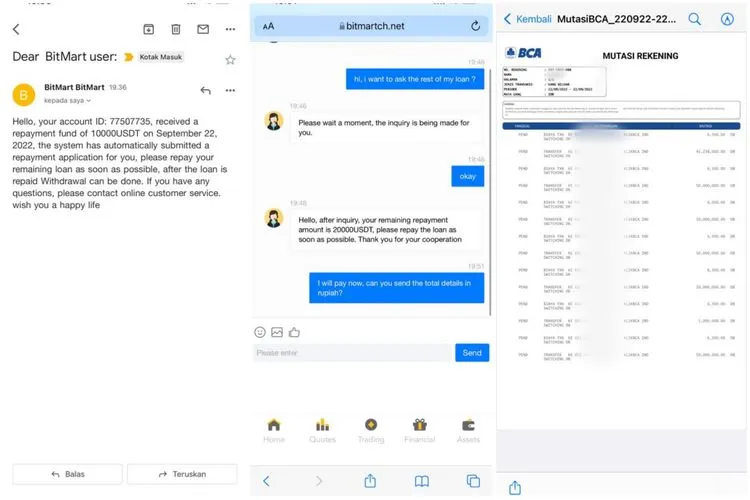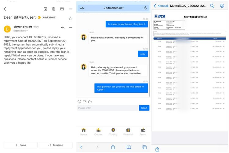 Ketika aset AA menyentuh hampir 92 juta rupiah, pria Korea itu memberitahu kepada AA bahwa platform bitmartch.net menyediakan pinjaman hingga 30.000 US dollar (setara 458,6 juta rupiah) tanpa bunga sama sekali.
