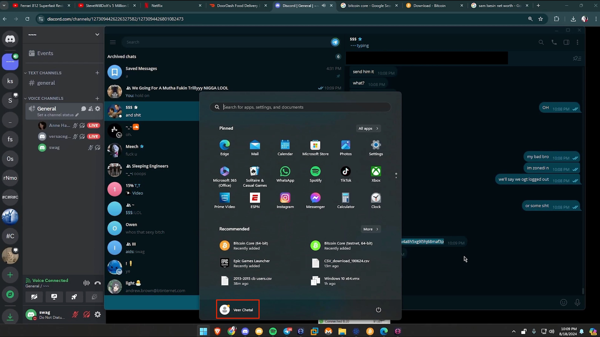 Salah satu nama pengguna yang bocor adalah Veer Chetal. Menurut ZachXBT, nama pengguna tersebut merujuk pada seorang pemuda berusia 19 tahun dari Danbury yang diduga dikenal dengan julukan “Wiz,” meskipun dalam rekaman video yang bocor, ia diduga menggunakan nama “Swag.” Kabarnya, Swag terlibat dalam tahap awal pencurian kripto tersebut, yaitu mendapatkan akses ke akun Gmail dan iCloud korban.