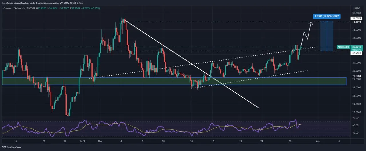 “Cosmos (ATOM) akan meng-upgrade jaringan mereka ke Theta yang akan meningkatkan kemampuan tata kelola jaringannya. Ini diperkirakan akan meluncur pada akhir Maret ini. Dari analisis teknikalnya, sentimen positif ini sudah bisa meningkatkan harga ATOM hingga 11%,” kata Afid.