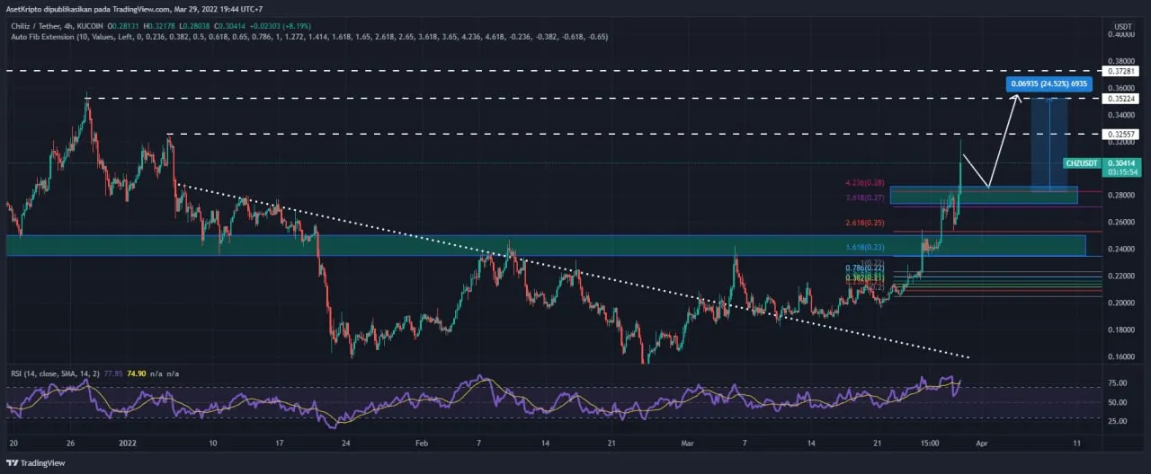 Afid menambahkan dari analisis teknikalnya nilai CHZ bisa melonjak hingga 24%. Namun, ia melihat akan ada sedikit koreksi sebentar, lalu akan rebound dari harga $ 0,28 bisa mencapai $ 0,35.