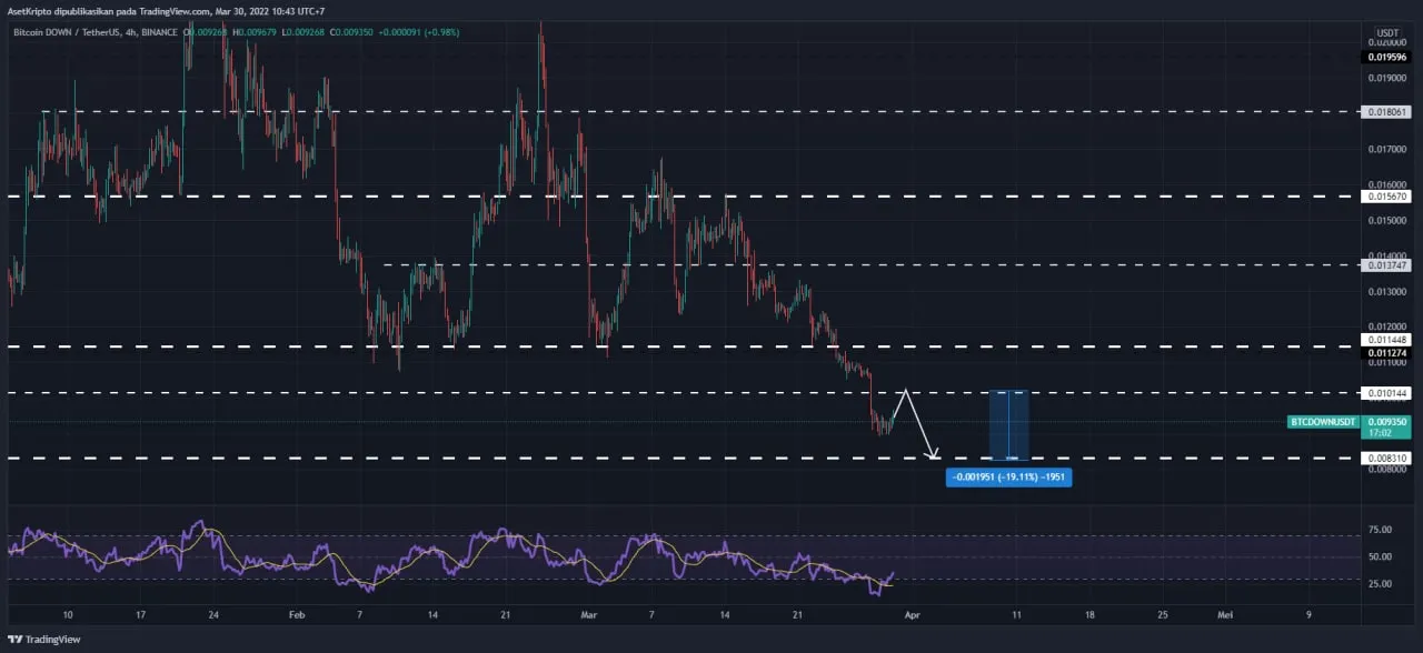 Bitcoin DOWN (BTCDOWN) berpeluang mengalami penurunan pada pekan terakhir Maret 2022 ini. Menurut Afid, kondisi market kripto sekarang turut berpengaruh negatif pada BTCDOWN karena Bitcoin sedang bullish yang saat ini sudah melewati harga $ 46.000.