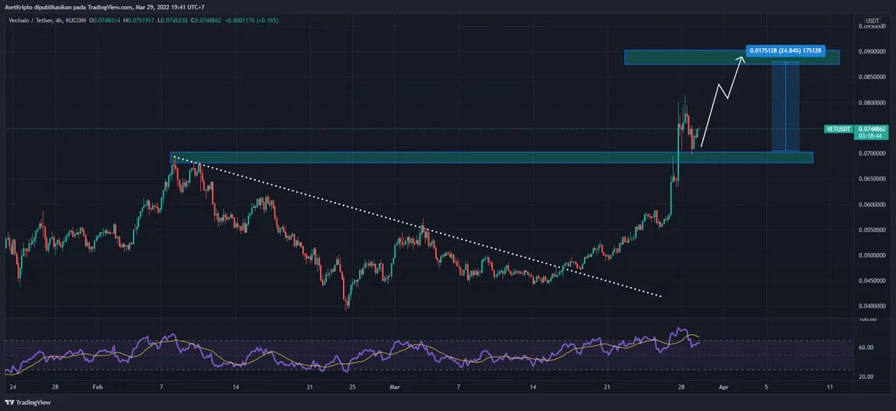 Afid menambahkan dari segi analisis teknikalnya VET sudah mengalami koreksi harga dan kini sedang bergerak naik. Kemungkinan besar peningkatan harganya bisa mencapai 24% dari harga $ 0,07.